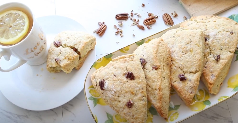 - Brush a light coat of heavy cream over the top of your scones. Add crushed pecans to the top of the dough, push down pecans in their place, and add some lemon zest. Place into the fridge for 15 minutes to firm the dough up before placing it into the oven. Sprinkle some sugar on the top and bake for 25-30 minutes, rotate the dish every 10 minutes until the edges become golden. After they have baked, allow them to cool off before enjoying them!